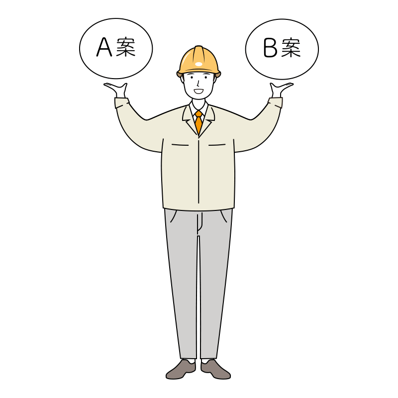 明るい笑顔で作業提案をする安全ヘルメット着用の作業員のイラスト