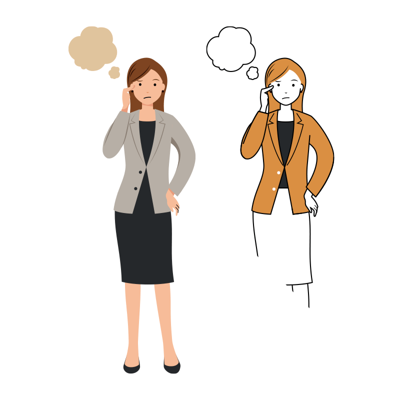 カジュアル服を着たロングヘアの女性ビジネスマン(会社員・OL)が、頭に指を当て、考え悩んでいるイラストです。シンプルで使いやすいオシャレでかわいいイラスト素材になっています。個人、法人、商用、非商用問わず(登録不要)無料でイラストを使う事ができます。