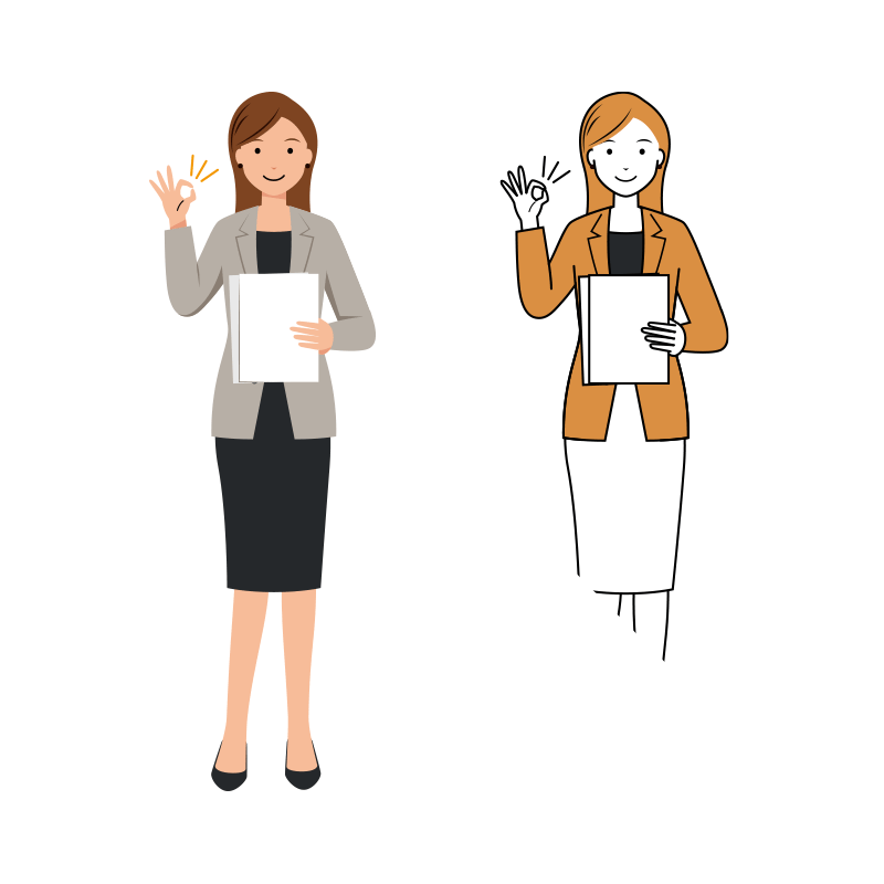 カジュアル服を着たロングヘアの女性ビジネスマン(会社員・OL)が、資料を読みOKサインを提示しているイラストです。シンプルで使いやすいオシャレなイラスト素材になっています。個人、法人、商用、非商用問わず(登録不要)無料でイラストを使う事ができます。