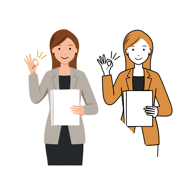 カジュアル服を着たロングヘアの女性ビジネスマン(会社員・OL)が、資料を読みOKサインを提示している上半身のイラストです。シンプルで使いやすいオシャレなイラスト素材になっています。個人、法人、商用、非商用問わず(登録不要)無料でイラストを使う事ができます。