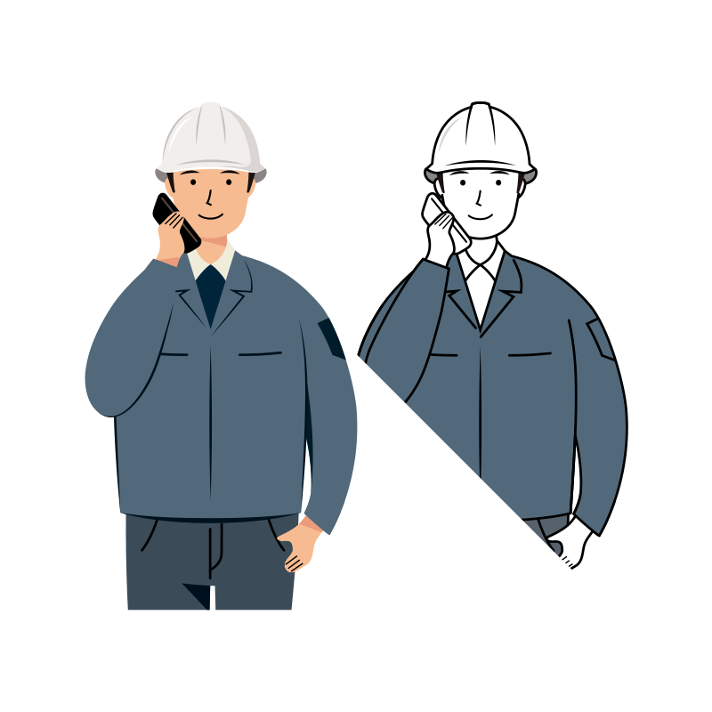 白い安全ヘルメット着用のネイビー色の作業着を着た男性・現場監督が、スマホで会話をしている上半身のイラストです。