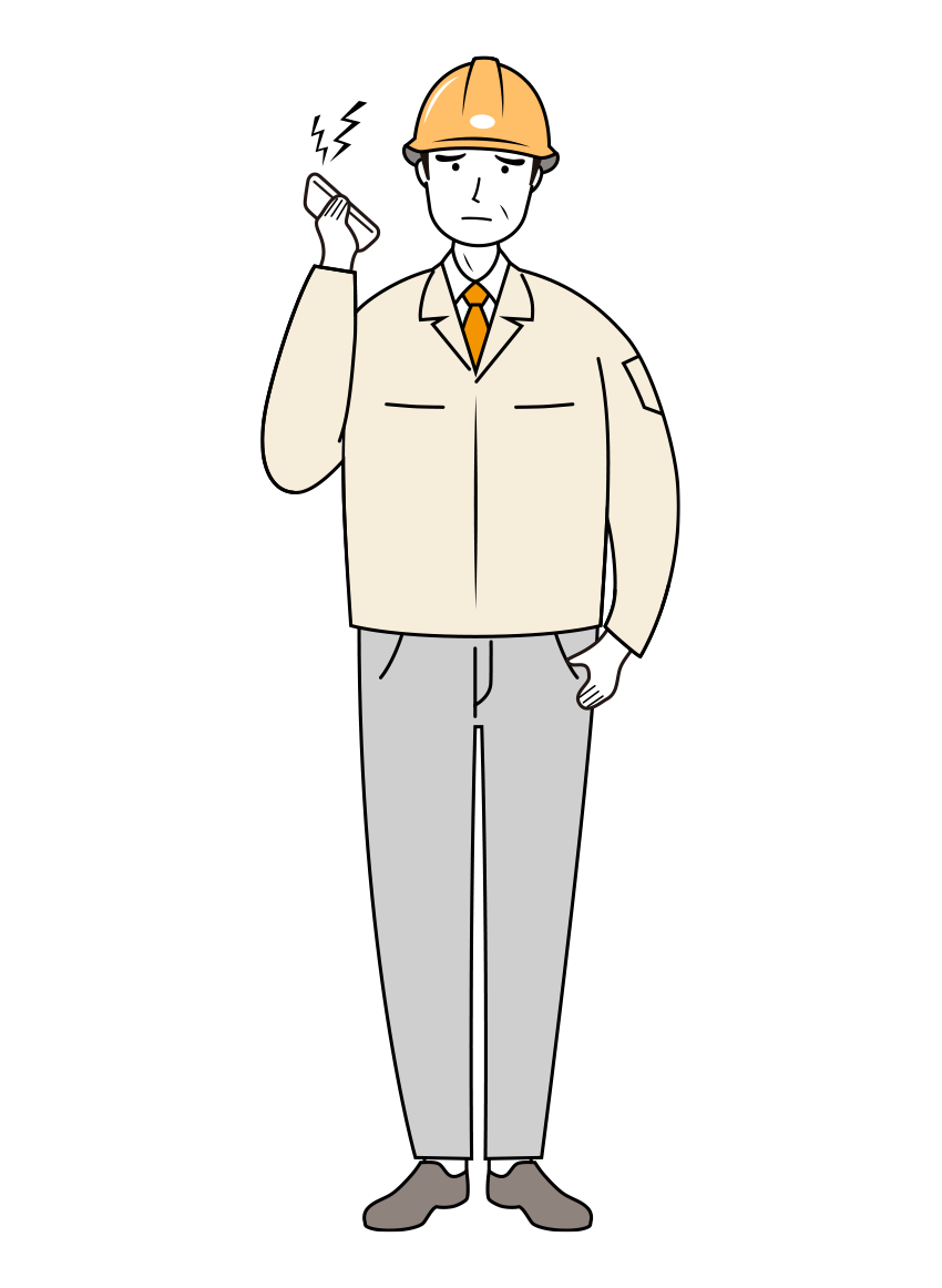 黄色い安全ヘルメットとベージュの作業着を着用した、シニア(Senior)でベテラン(Experienced)現場監督が、右手でスマホを持ち電話をしている全身のイラストです。
