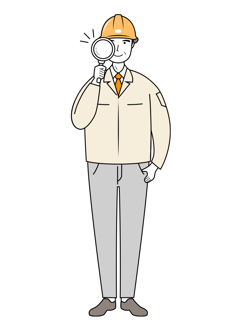黄色い安全ヘルメットとベージュの作業着を着用した、シニア(Senior)でベテラン(Experienced)現場監督が、右手に虫眼鏡を持ち、不備が無いか細かい箇所までチェック作業をしている全身のイラストです。
