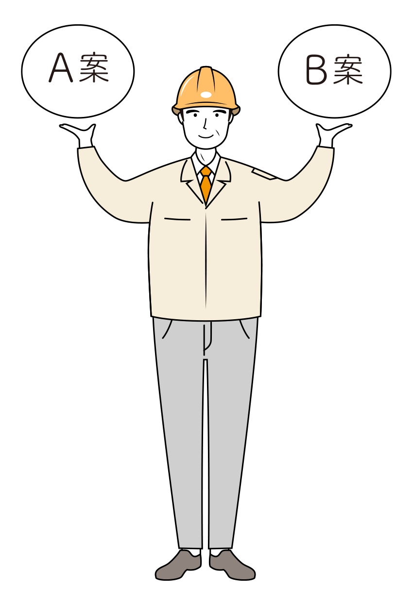 黄色い安全ヘルメットとベージュの作業着を着用した、シニア(Senior)でベテラン(Experienced)現場監督が、新しいプランの提示をしている全身のイラストです。