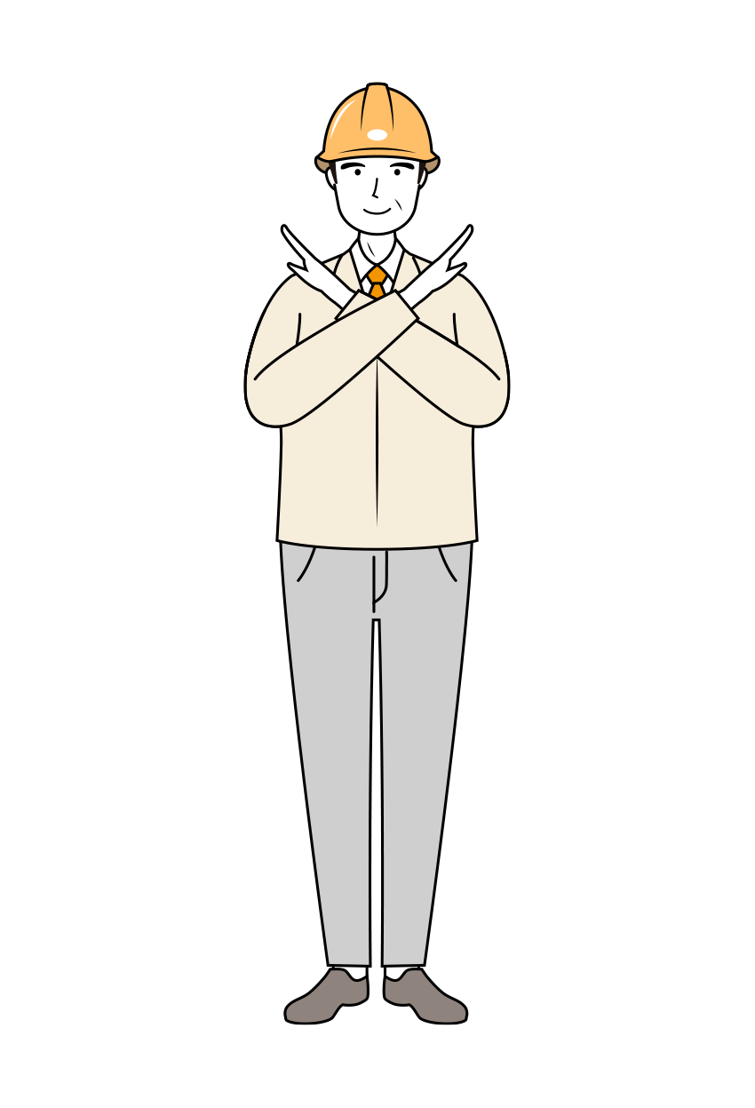 黄色い安全ヘルメットとベージュの作業着を着用した、シニアでベテラン現場監督が、両腕を使いNGサインを出している全身のイラストです。