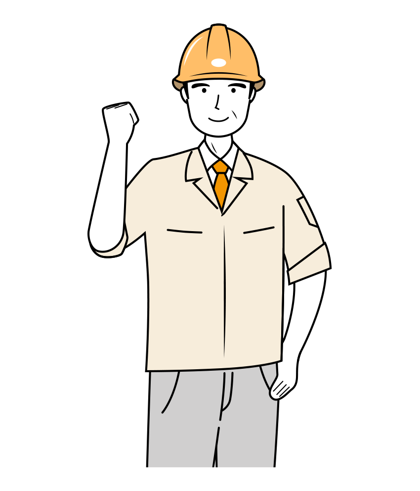 黄色い安全ヘルメット着用の、ベージュ作業着を着たシニア(ベテラン)・現場監督が、右手を上げてガッツポーズをしている上半身のイラストです。
