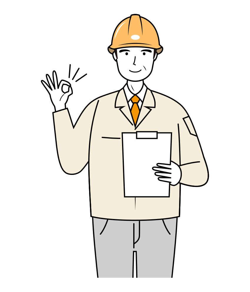 黄色い安全ヘルメットとベージュの作業着を着用した、シニアでベテラン現場監督が、資料を片手に持ちOKサインをする上半身のイラストです。