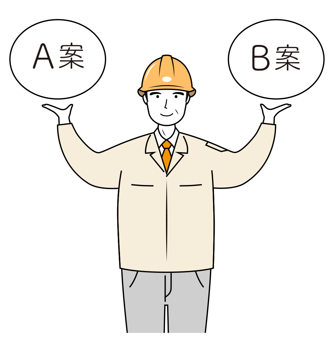 黄色い安全ヘルメットとベージュの作業着を着用した、シニアでベテラン現場監督が、新しいプランの提示をしている上半身のイラストです。