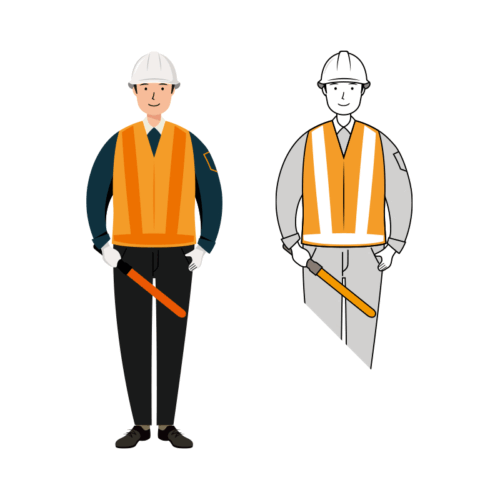 紺色の作業着を着た男性の交通誘導員が、右手に誘導棒を持ち待機している全身のイラストです。