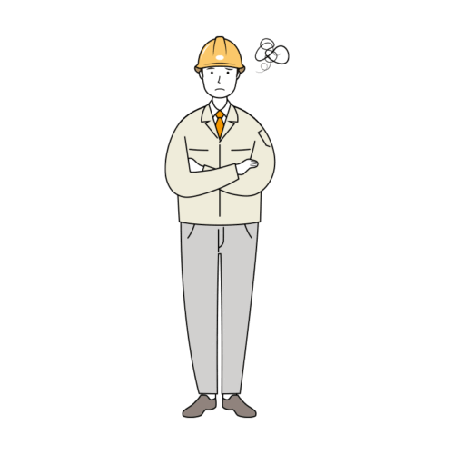 不安な顔で考え事する、安全ヘルメット着用の現場作業員のイラスト素材です。オシャレでシンプルな使いやすいイラスト素材になっています。個人、法人、商用、非商用問わず(登録不要)無料でイラストを使う事ができます。