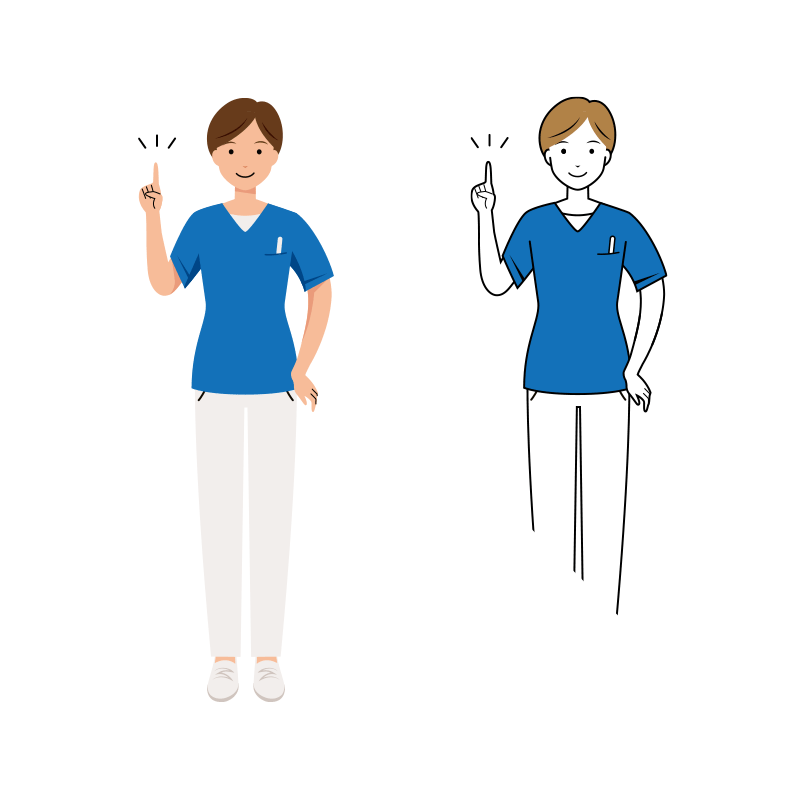 スクラブ服を着たショートヘアの女性看護師(医療・福祉)が、アドバイスをしている正面のイラストです。シンプルで使いやすい、オシャレでかわいい無料フリー素材です。