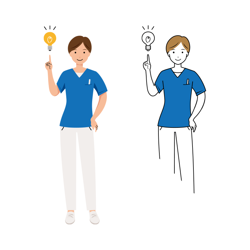 スクラブ服を着たショートヘアの女性看護師(医療・福祉)が、新しい発見にひらめいた瞬間の正面イラストです。シンプルで使いやすい、オシャレでかわいい無料フリー素材です。