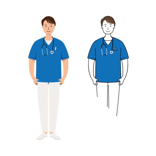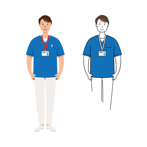 スクラブ服を着た男性看護師(医療・福祉・介護・歯科・動物病院)が、聴診器を首から下げている正面のイラストです。シンプルで使いやすい、オシャレでかわいい無料フリー素材です。
