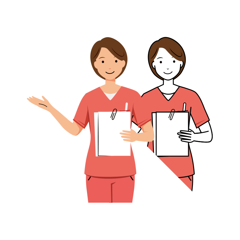 優しいコーラルピンクのスクラブ服を着用した、ショートヘアの女性歯科衛生士(産婦人科・小児科看護師)が、カルテを左手に持ち診察の案内をしている上半身のイラストです。シンプルで使いやすい、オシャレでかわいい無料フリー素材です。