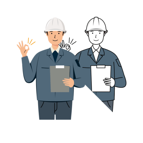 白い安全ヘルメット着用の、ネイビー色の作業着を着た男性、現場監督が、右手を使い笑顔でOKサインを出している上半身のイラストです。