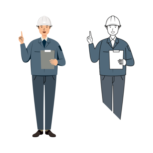 白い安全ヘルメット着用の男性・現場監督(現場全体の指揮・監督)が、資料を左手に持ち工事の内容を説明している正面のイラストです。印刷しても色が沈まない配色で、シンプルかつオシャレなイラストになっています。