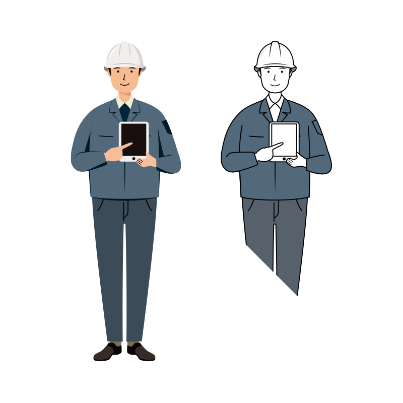 白い安全ヘルメット着用の男性・現場監督(現場全体の指揮・監督)が、業務用タブレットを使い業務説明をしているイラストです。印刷しても色が沈まない配色で、シンプルかつオシャレなイラストになっています。
