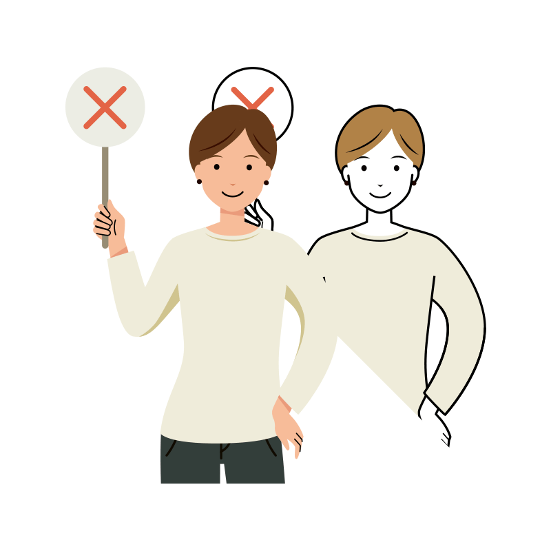 不正解、バツの札を上げる女性、人物、日常のイラストです。シンプルで使いやすいオシャレなイラスト素材になっています。個人、法人、商用、非商用問わず(登録不要)無料でイラストを使う事ができます。