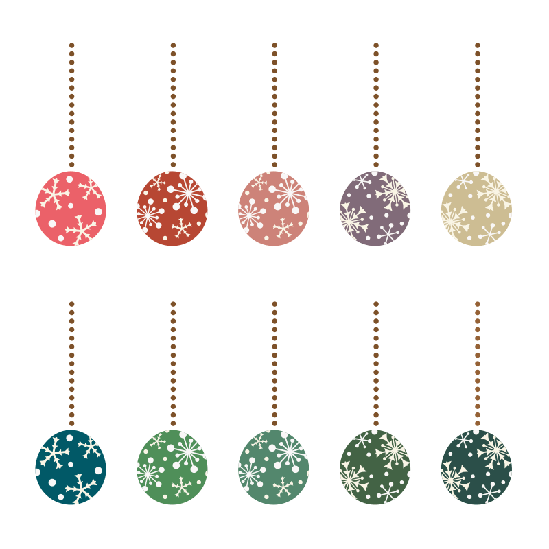 クリスマスオーナメントのイラストです。カラーは10色、明るさをおさえた色合いになっています。オシャレでかわいいイラスト素材になっています。個人、法人、商用、非商用問わず(登録不要)無料でイラストを使う事ができます。