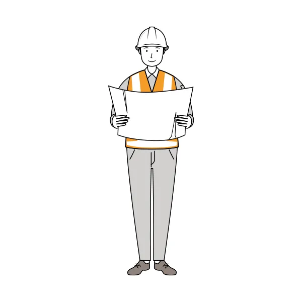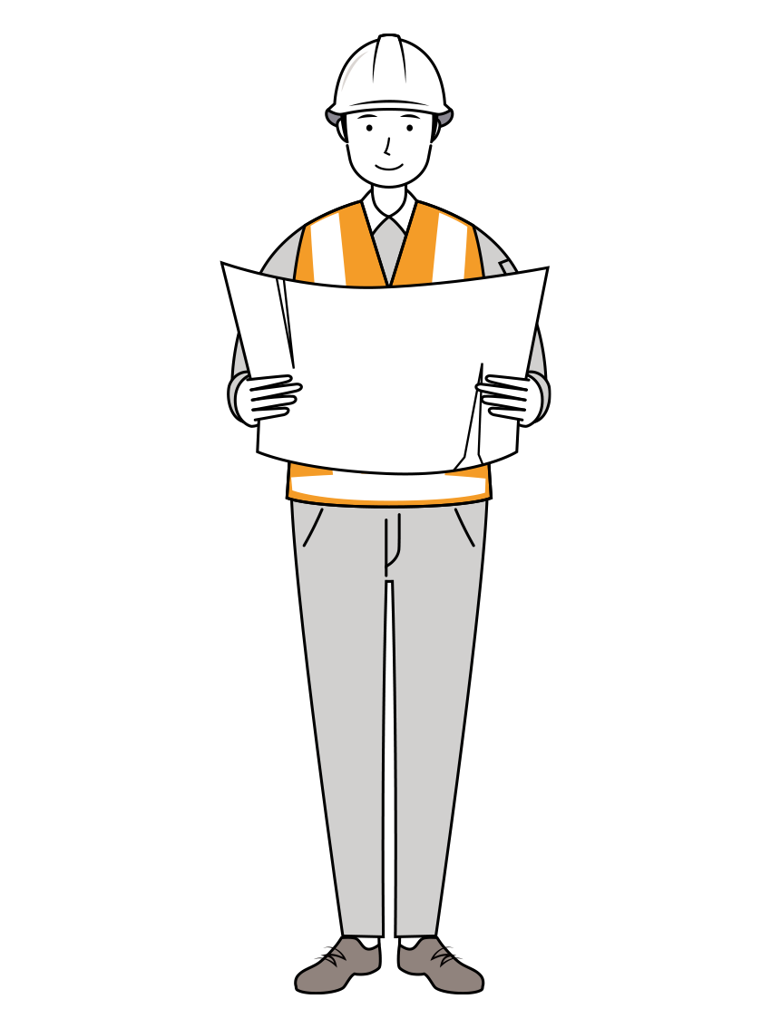 反射ベストを着た男性の「交通誘導員」が、地図を使い、周辺の道路確認や配置場所の確認をしている全身の「線画イラスト」です。