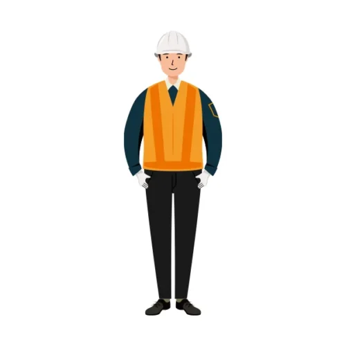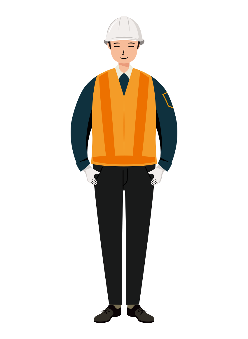 反射ベストを着た男性の交通誘導員が、安全ヘルメットを被りお辞儀(会釈)をしている全身のイラストです。