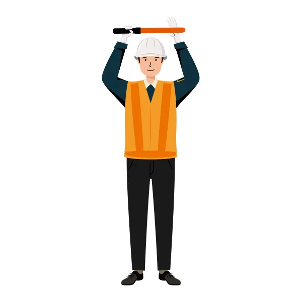 反射ベストを着た男性の交通誘導員が、両手を頭の上まであげ、誘導棒を水平に持ち停止指示を出している全身のイラストです。