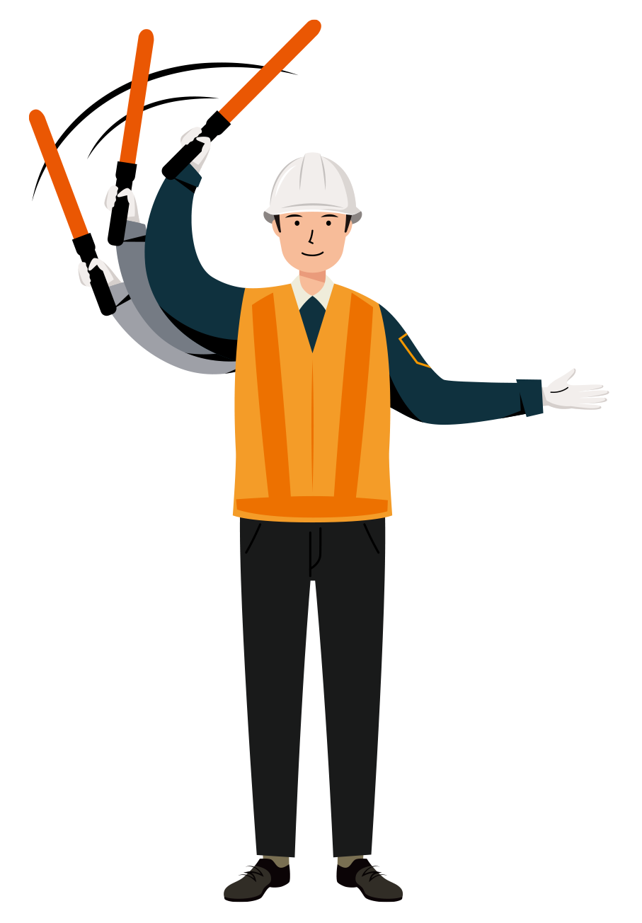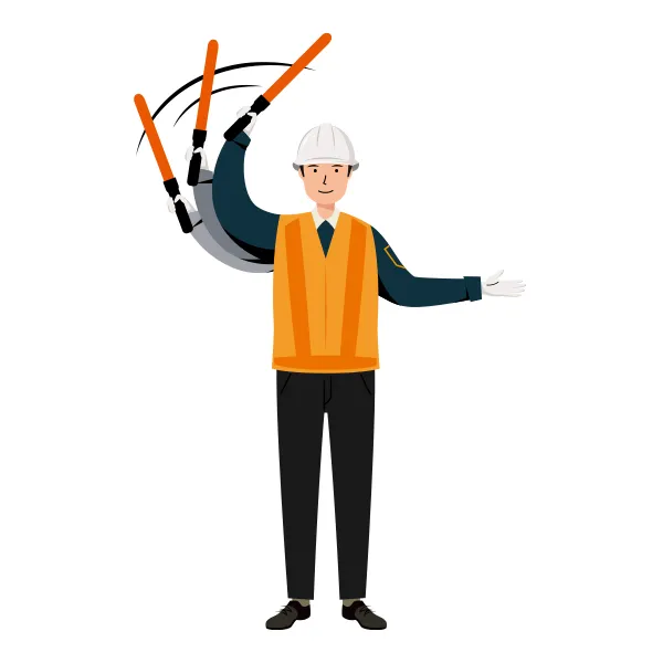 反射ベストを着た男性の交通誘導員が、両手を頭の上まであげ、誘導棒を水平に持ち停止指示を出している全身のイラストです。