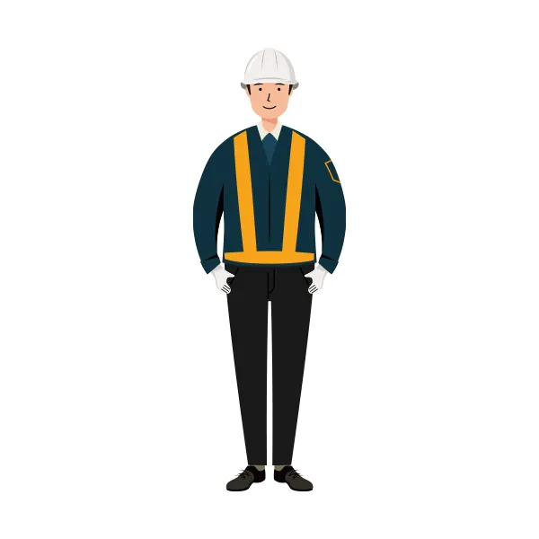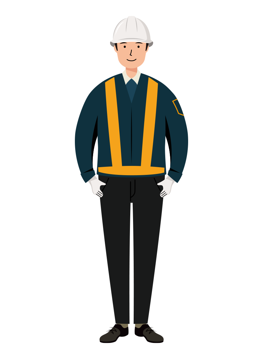 紺色作業着を着た男性「交通誘導員」が、安全ヘルメットを被り姿勢正しく前を向いている全身のイラストです。