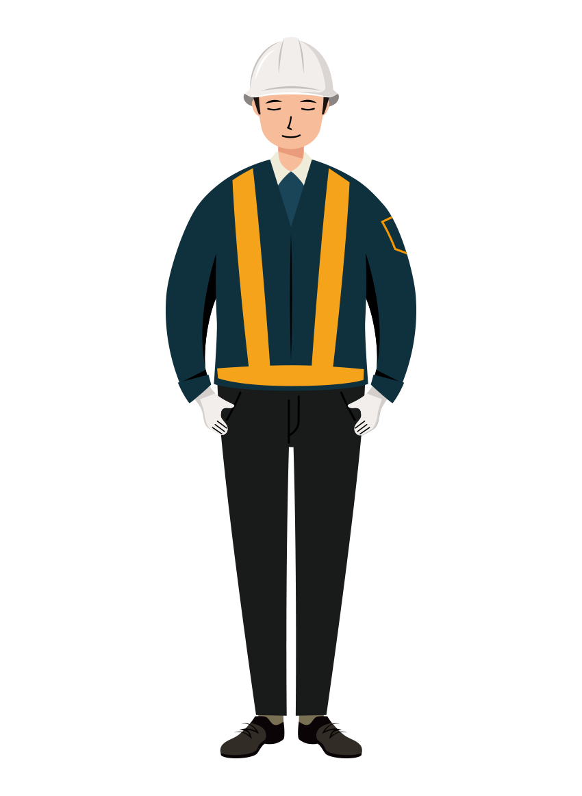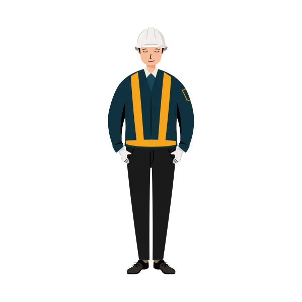 紺色作業服を着た男性の交通誘導員が、安全ヘルメットを被りお辞儀(会釈)をしている全身のイラストです。