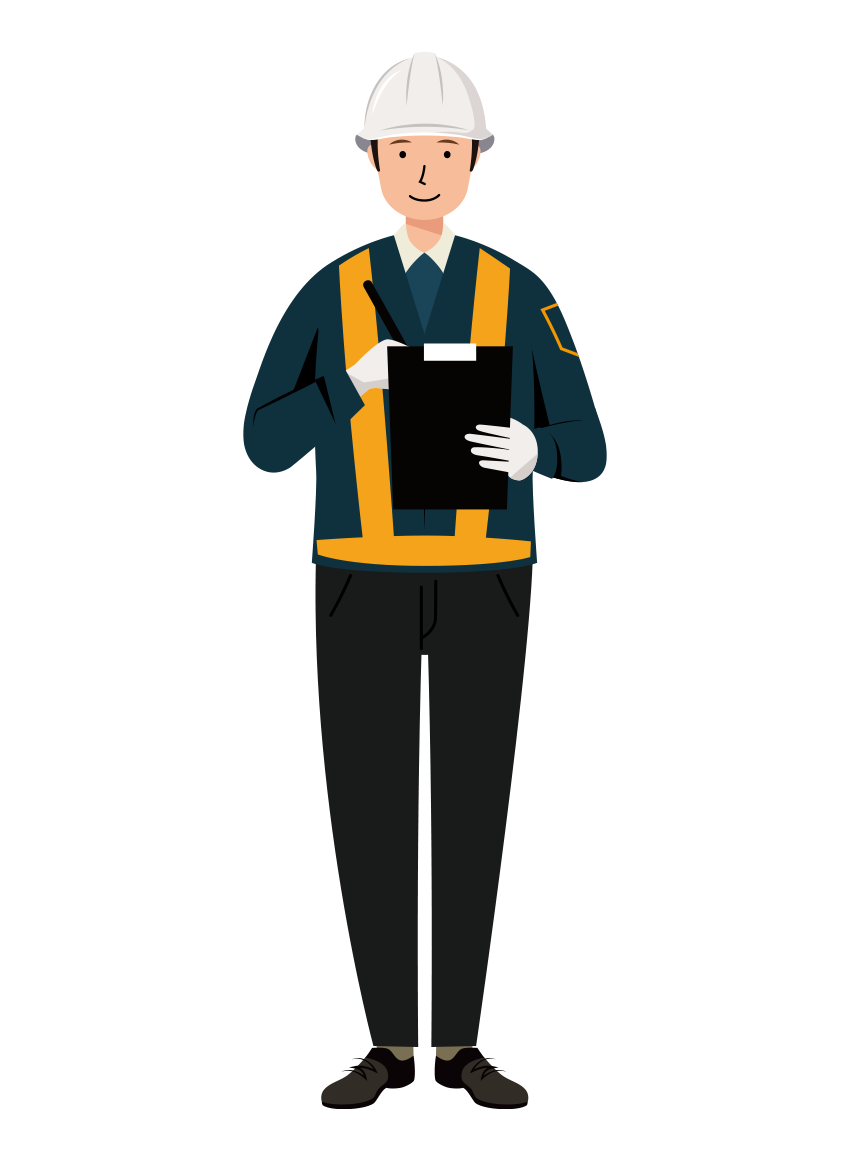 紺色作業着を着た男性の交通誘導員が、現場日報の記入や状況記録のためにメモを取る全身のイラストです。