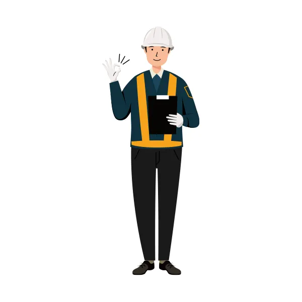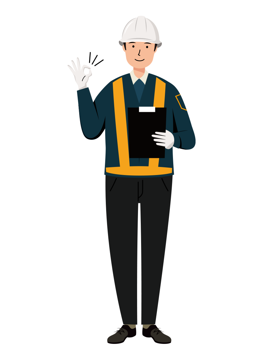 紺色作業着を着た男性の交通誘導員が、左手に資料を持ち、右手でOKサインを出している全身のイラストです。