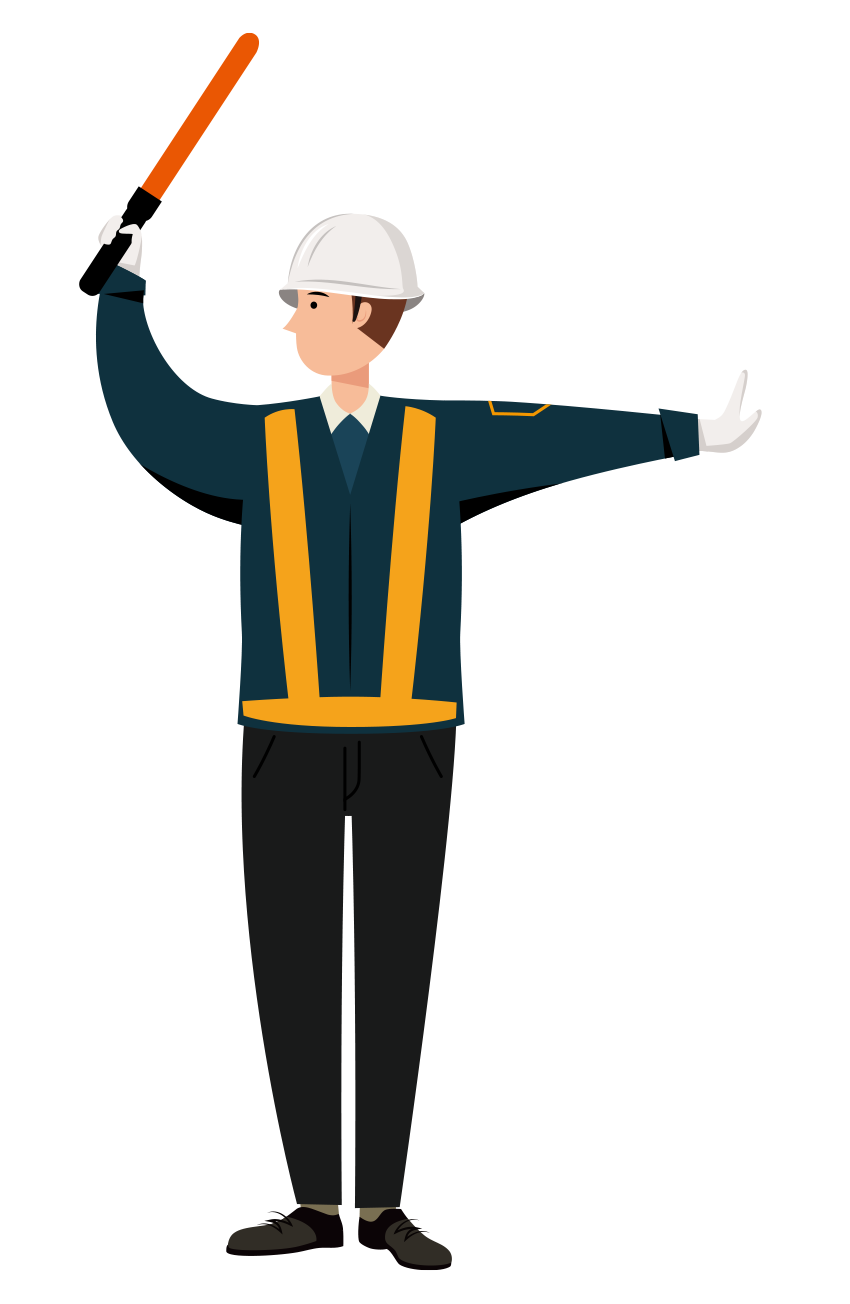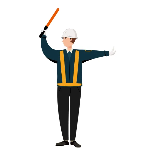 紺色作業着を着た男性の交通誘導員が、右手に誘導棒を持ち、左手で停止の合図を出し交通整理をしている全身のイラストです。